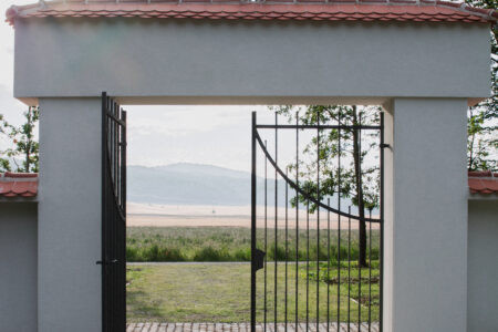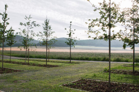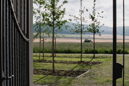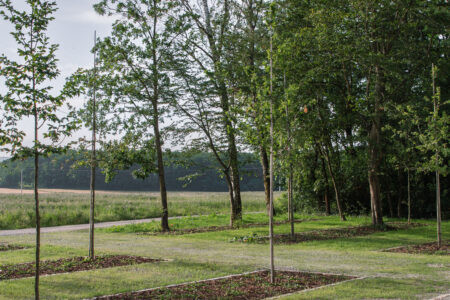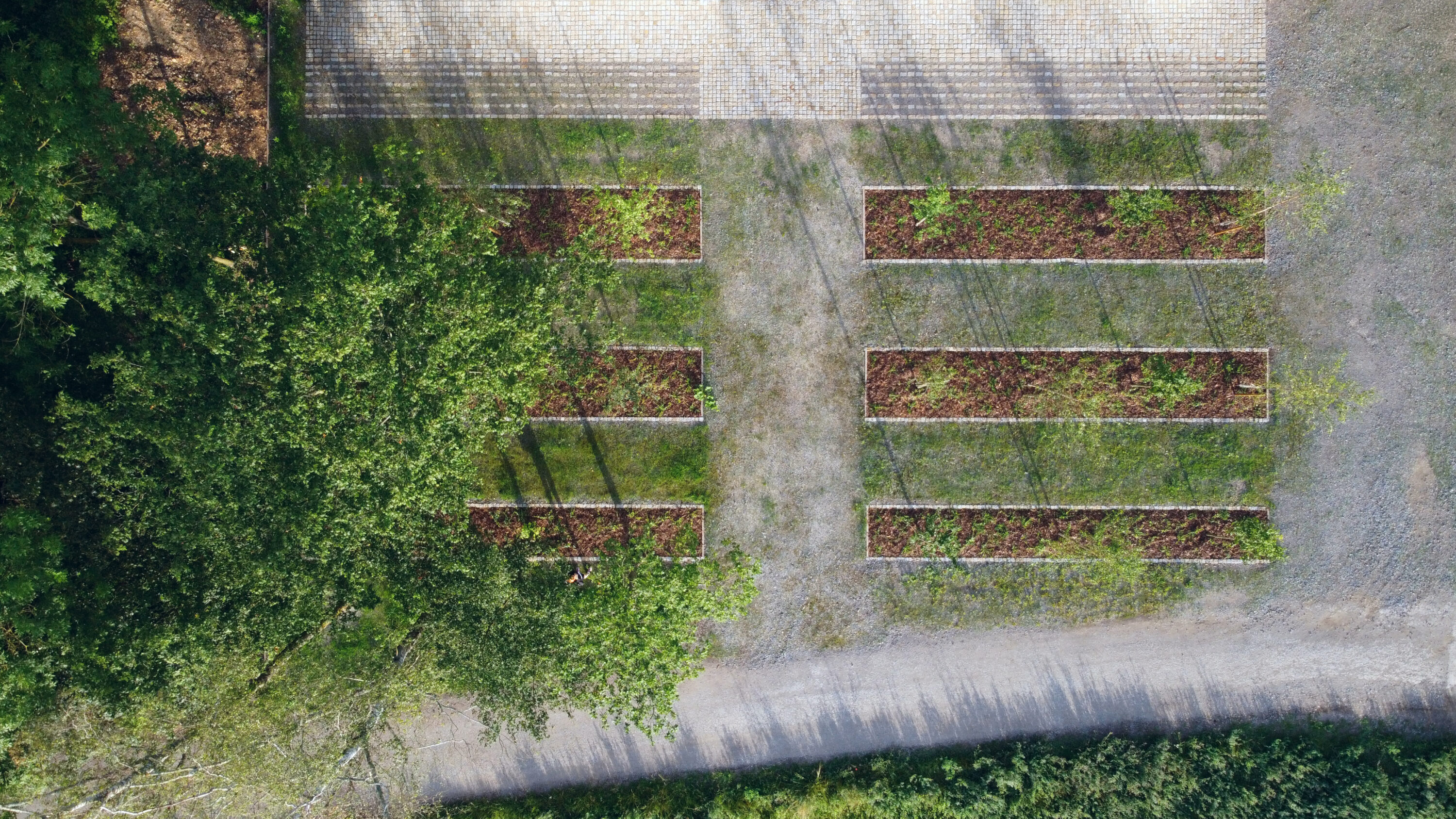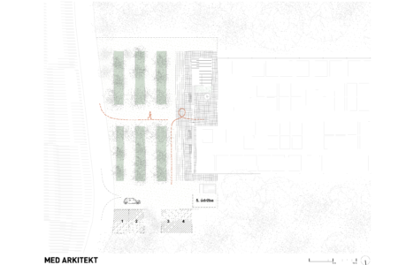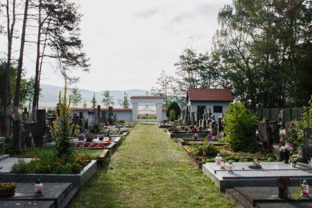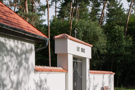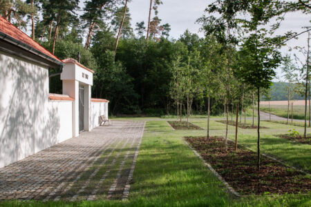 Koncepce vstupu na hřbitov vychází ze zachování lesní struktury a propojení návrhu s kontextem místa. Vstup je založen na lineárním kompozičním principu, který vytváří příjemný rastr stromů. Střídání stromů odhaluje a rámuje průhledy do okolní krajiny a utváří tak scénický prostor. Druhová skladba stromů odpovídá okolnímu lesu a je volena s ohledem na jejich životní strategii. Stávající stromy byly zachovány a zajišťují klidný přechod mezi lesem a nově navrženým předprostorem. Hlavní osa je definována geometricky kladenou kamennou dlažbou, která se směrem za hřbitovem postupně rozplývá v krajině. Ostatní plochy sjednocuje štěrkový trávník. Obnovený vstup doplňují kovářské prvky, včetně dvoukřídlé brány a kříže. Ty byly na základě architektonického návrhu zhotoveny z litiny místním kovářem. Návrh zahrnuje také drobný mobiliář a parkovací stání, které jsou umístěny mírně stranou, mimo hlavní kompoziční prostor.